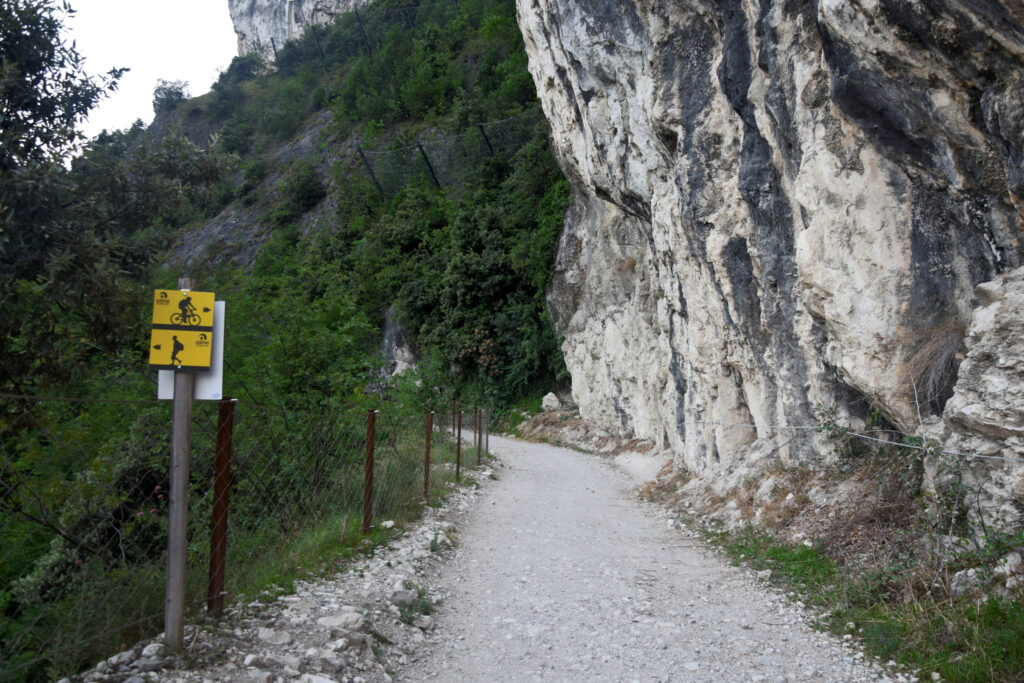 Nauczeni doświadczeniami z Sardynii spodziewaliśmy się, że szlaki w północnych Włoszech także mogą pozostawiać sporo do życzenia. Nic bardziej mylnego! Jezioro Garda to mekka rowerzystów z Włoch, Niemiec i Austrii (zresztą nie tylko) – jakość i dobre oznakowanie stanowią tu priorytet. Chociaż nie korzystaliśmy zbyt intensywnie z aplikacji dedykowanej do planowania tras rowerowych, na szlakach nie sposób się zgubić. Na każdym skrzyżowaniu szlaków znajdują się drogowskazy z czasem przejazdu, nierzadko mapa okolicy i miejsca odpoczynku. Z racji dużego ruchu w sezonie, ścieżka jest podzielona na ruch pieszy i rowerowy (w przypadku, gdy szlaki się łączą).