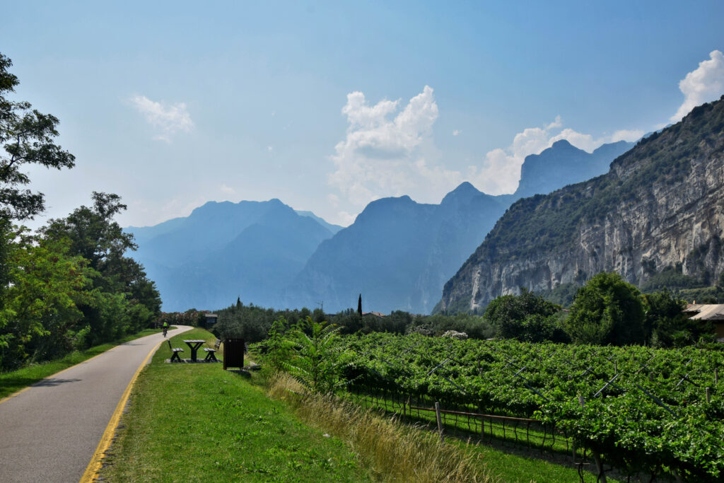 Najłatwiejsza ze wszystkich czterech tras – tym razem nie wspinamy się na żadną górę ani przełęcz. Równy asfalt prowadzi od brzegu jeziora w Riva del Garda wzdłuż malowniczo położonej rzeki Sarca. Ścieżka rowerowa jest poprowadzona w większości niezależnie od dróg publicznych, za to najbliżej rzeki, jak się tylko da. Przeskakując co chwila na drugi brzeg Sarca, wije się między jednorodzinną zabudową i licznymi w tym rejonie winnicami. Drugi plan stanowią skaliste, górskie masywy (szczególnie malownicze po stronie wschodniej), sięgające nawet 1500 m.n.p.m.
