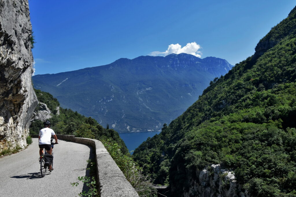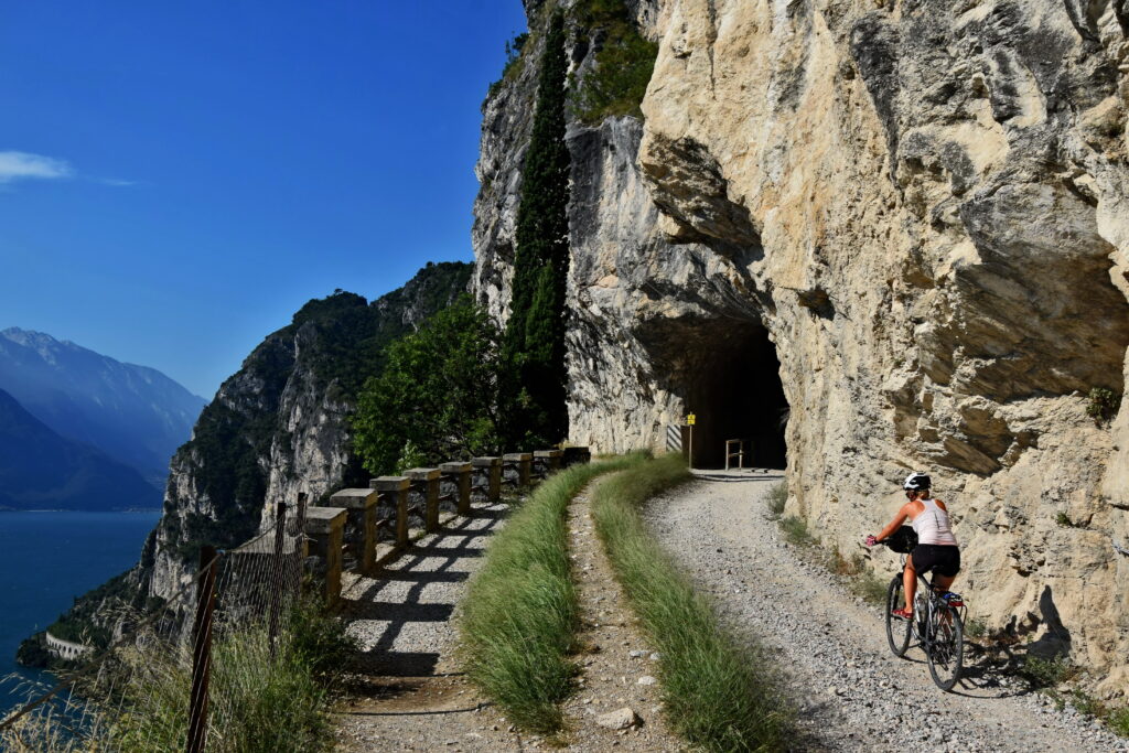 Bez wątpienia Via del Ponale to najciekawsza trasa w okolicach Riva del Garda. Jeżeli szukając informacji o szlakach nad Gardą wpadliście na zdjęcia wykutej w skalnym zboczu drogi, jakby zawieszonej nad turkusową taflą jeziora, dziarsko wspinającą się pod górę i co rusz chowającą się w tunelu… to właśnie trasa do Pregasiny!