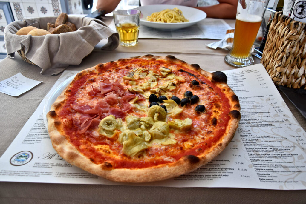 Nad jeziorem znajdziemy pola campingowe, plaże i restauracje. Sami skusiliśmy się na włoską pizzę – przecież należy się nam po takim podjeździe 😉