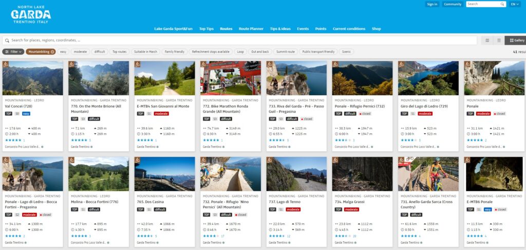 Planowanie trasy w oparciu o stronę gardatrentino.it (lub powiązaną z nią aplikację na telefon) pozwala na wybór jednej z już dostępnych tras. W opisie każdego szlaku są wyszczególnione szczegółowe informacje – rodzaj nawierzchni, różnica wysokości, długość, ciekawe miejsca po drodze, punkty widokowe i miejsca odpoczynku. Można sortować trasy według przeznaczenia (np. na rodzinne wycieczki, trasy dla kolarzy lub MTB). Po kliknięciu w interesującą nas trasę otrzymujemy jej szczegółowy opis po angielsku („krok po kroku”), spodziewane trudności, interaktywną mapę wraz z możliwościami skrócenia. Ślad trasy można pobrać na GPS; są nawet filmiki z przejazdu!