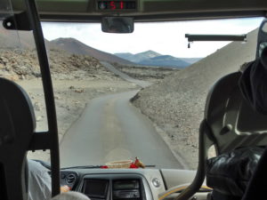 Park Narodowy Timanfaya (a przynajmniej jego główna część) jest udostępniony do zwiedzania tylko i wyłącznie z okien turystycznych autokarów, które przemierzają 10-kilometrową trasę po wąskiej nitce asfaltu. Kręta droga jest poprowadzona przez fantastyczne tereny, autokar pokonuje znaczne wzniesienia, a kierowca z nonszalancją przeciska się przez lawowe wąwozy. Przez okna podziwiamy niesamowity krajobraz pozbawiony życia, na horyzoncie nie majaczy nawet jedno drzewo. Czuję się trochę jak na Islandii z tą różnicą, że tam lawowe gruzowisko szybko pokrywa się mchem i innymi porostami, ze względu na wilgotny klimat. Tutaj mamy wrażenie, jakby ostatnia erupcja miała miejsce wczoraj, a nie 200 lat temu.